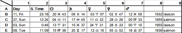 So, according to the contemporary point of view expounded by astrologers, I uncovered these cases one after another because of what we could call the responsive universe or ‘the moment of astrology’ or Koestler’s 'library angel'. Or, perhaps it's just because they occur at excessively statistically significant rates in relationships, I effectively scientifically predict that they will be there in choice-based relationships and find them because they happen more often than they should and I just know where to look and what to look for (and as they occur more often than they should, I have an increased chance of finding them). Both interpretations are valid, but the scientific explanation is simpler. And remember, these examples are - in part - of people who are/were paragons of astrology skepticism. If you are unconvinced by this, revisit the results and control group results pages and/or learn how to interpret scientific data. It is easy to predict that in any set of intimate relationships that are choice-based in nature (this includes same-sex relationships and one-night stands, but does not include arranged or coerced relationships) you will be able to make the same scientific prediction. There are other close aspects in the relationships, but unless highlighted none have shown high significance in large-scale experimentation. It's important to note that in one cohort - relationships that do not end in marriage (technically love affairs) - the p-p Venus-Mars trine (there is one between Ayer and Salmon) occurs at the same rate as the n-p Sun-Venus trine which is highly significant. Also, p-p Venus-Venus trines occur at consistently higher rates than would be expected, although their significance is drowned out by the Sun-Venus aspects that occur at - sorry - astronomical rates.